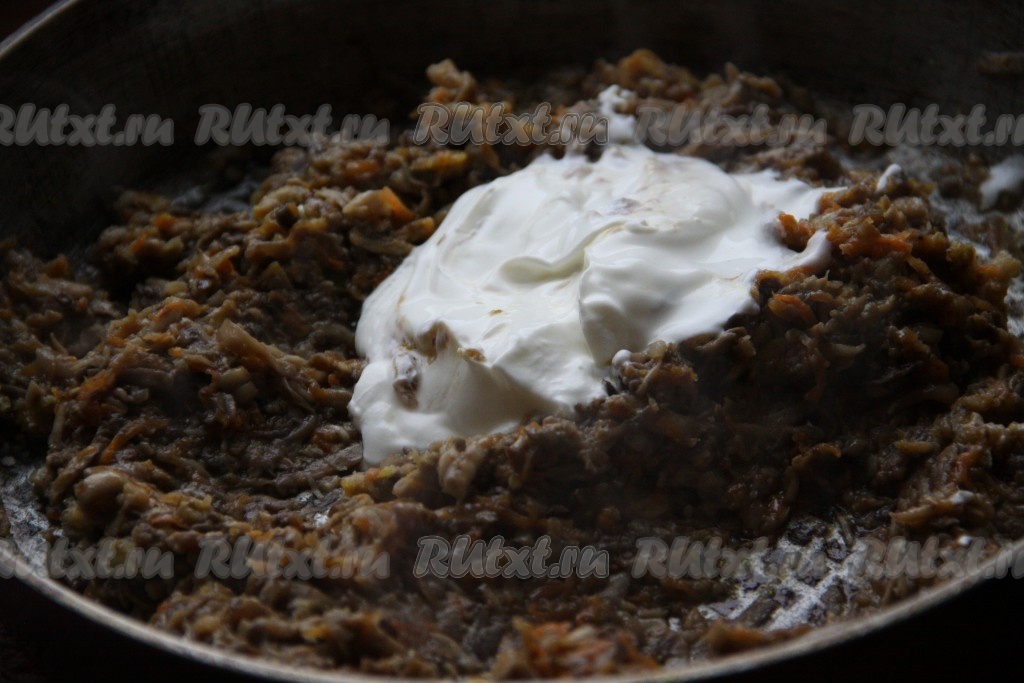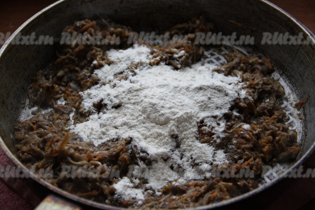 Готовить зажарку на среднем огне, помешивая, в течение нескольких минут, пока не испарится вся жидкость со сковороды. Затем добавить к обжаренным грибам муку и очень хорошо перемешать.