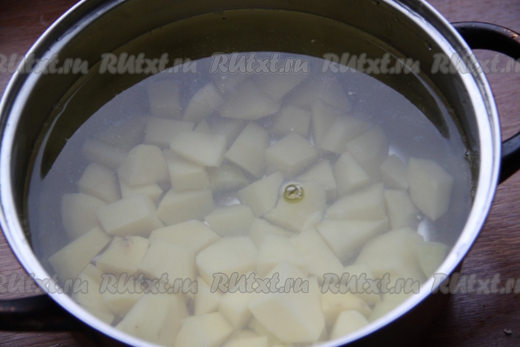 Картофель очистить, нарезать кубиками, залить водой, поставить на огонь, довести до кипения, а затем варить на небольшом огне до готовности (на это понадобится, в зависимости от сорта картошки, 15-20 минут).