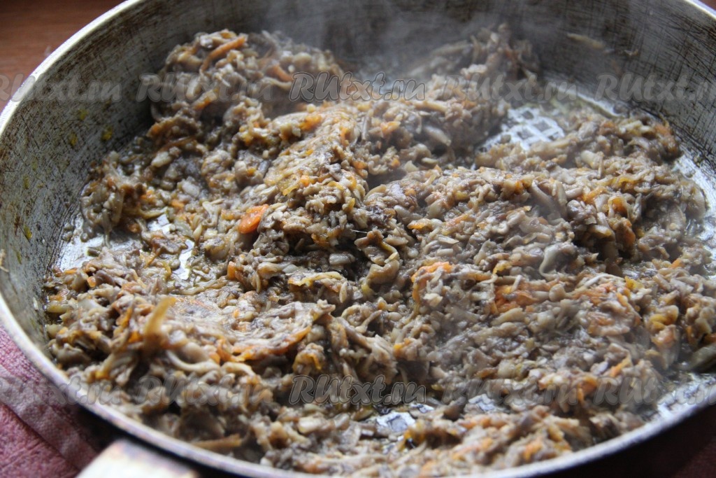 Пока картофель варится, можно приготовить зажарку, для этого мелко нарезанный лук и натёртую на мелкой тёрке морковь нужно обжарить на растительном масле, периодически помешивая, до золотистого цвета, затем добавить шампиньоны, натертые на крупной терке.