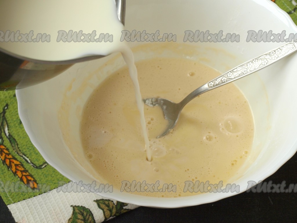 Молоко подогреть и влить в миску тонкой струйкой, хорошо перемешивая.