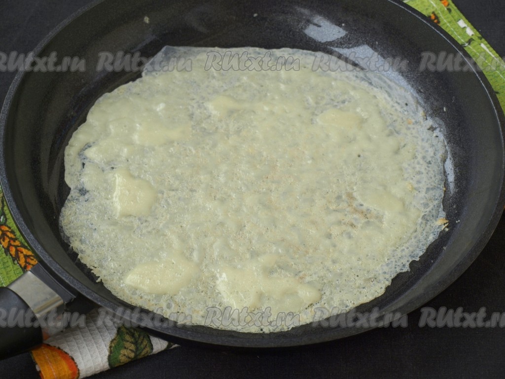 Сковороду разогреть и смазать растительным маслом с помощью силиконовой кисточки. Половником наливать тесто, держа сковороду под наклоном.