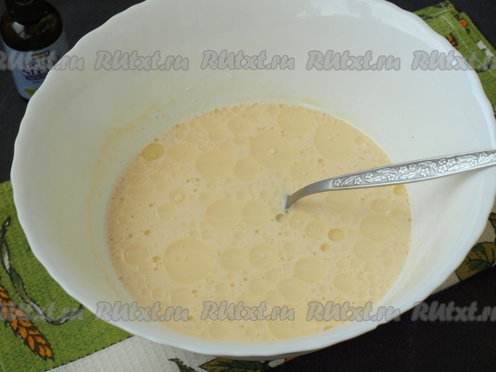 Добавить стевию (или сахар) и рафинированное растительное масло, перемешать. Тесто получается достаточно жидким.