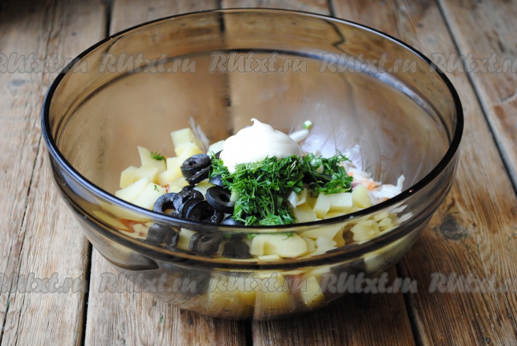 Вкусный салат из квашеной капусты с картошкой готов. Разложить его по порционным салатницам и подавать на стол.