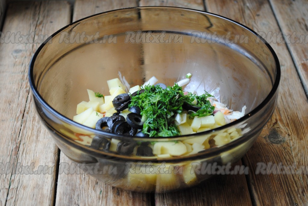 Оливки, нарезанные кольцами, добавить в салат.