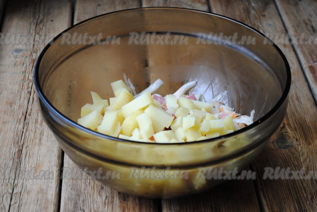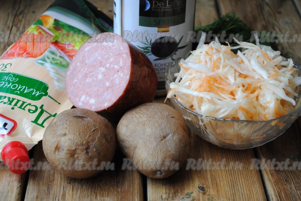 Картошку вымыть и сварить в мундире до готовности, затем остудить, очистить, нарезать кубиками и добавить в салат к квашеной капусте и колбасе.