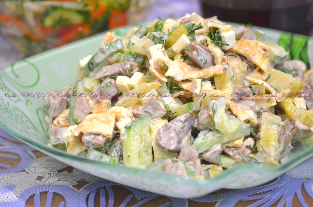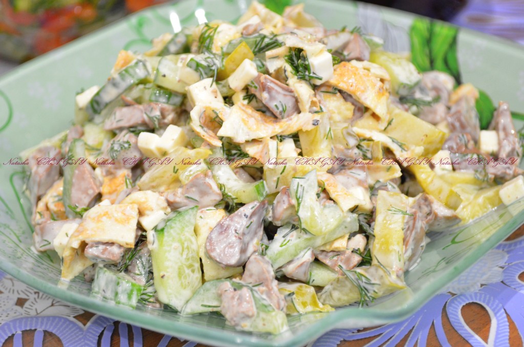 На праздник приготовила вкусный и сытный салат из куриной печени, яичных блинчиков, сыра, свежего и маринованного огурцов. Салат понравился и мне, и моим близким. При желании в это блюдо можно добавить только маринованные или только свежие огурчики. Любителям печени обязательно придётся по вкусу этот замечательный салат!