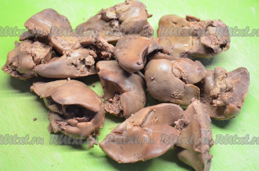 Нарезать варёную куриную печень на небольшие кусочки.