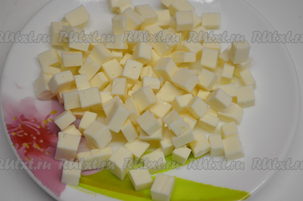Сыр нарезать на маленькие кубики (я использовала достаточно твёрдый плавленный сыр) или натереть на крупной тёрке.