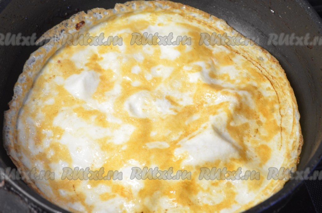 Жарить блинчик с двух сторон до золотистого цвета на среднем огне. Аналогично приготовить яичный блинчик из второго яйца. Блинчики остудить.