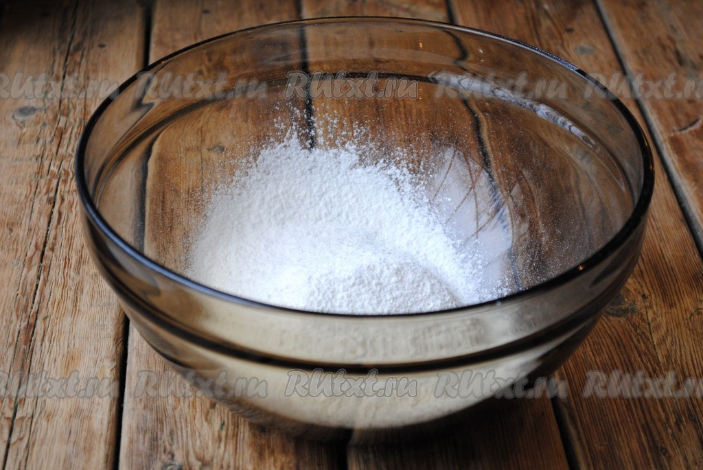Пшеничную муку просеять в миску, добавить соду, перемешать.