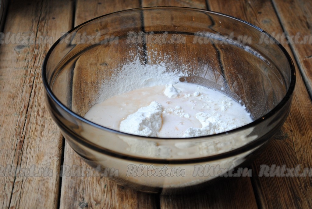 Влить в смесь муки и соды рассол из квашеной капусты, перемешать. Тесто для оладий по консистенции должно получиться, как густая сметана.