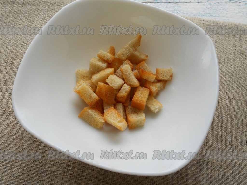 Сбрызнуть кусочки батона растительным маслом и обжарить на среднем огне на разогретой сковороде до румяности со всех сторон. Дать сухарикам остыть.