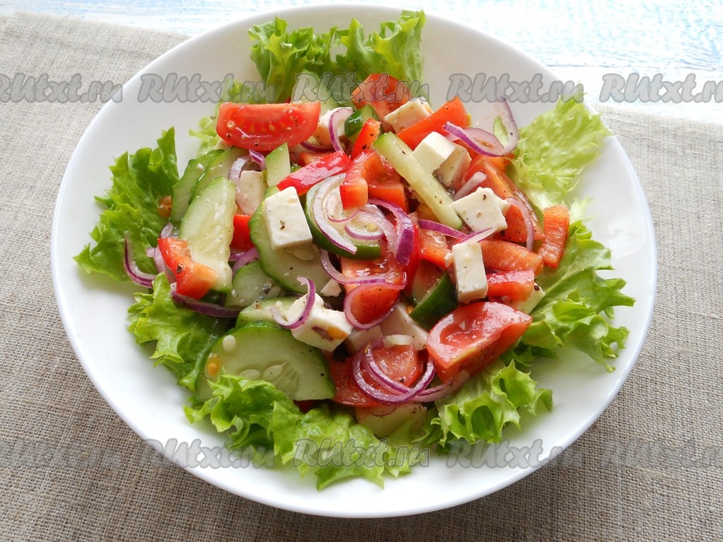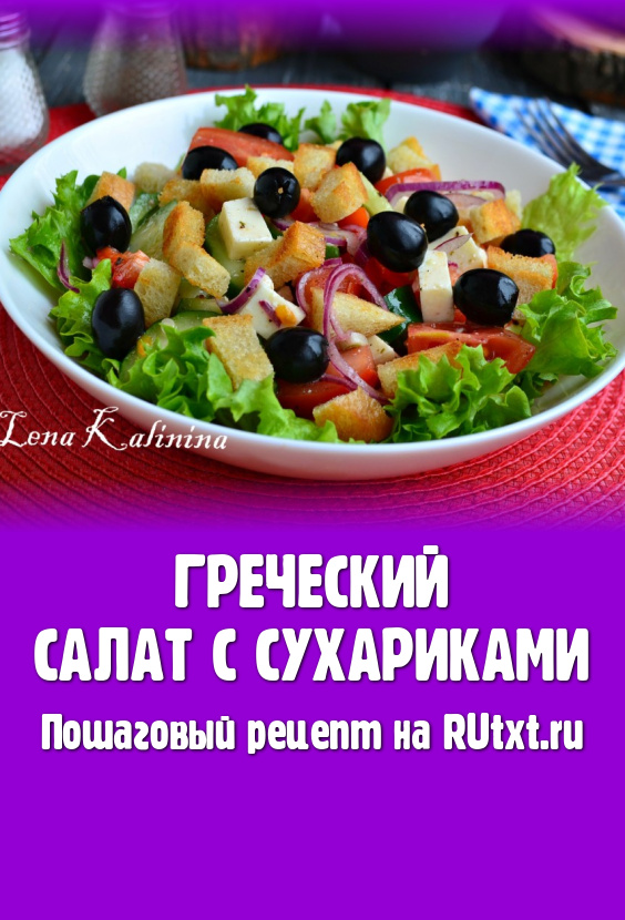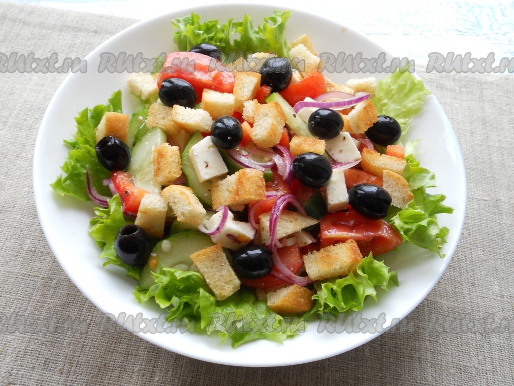 Вкусный, ароматный, сочный греческий салат с приятно похрустывающими сухариками сразу подать к столу.