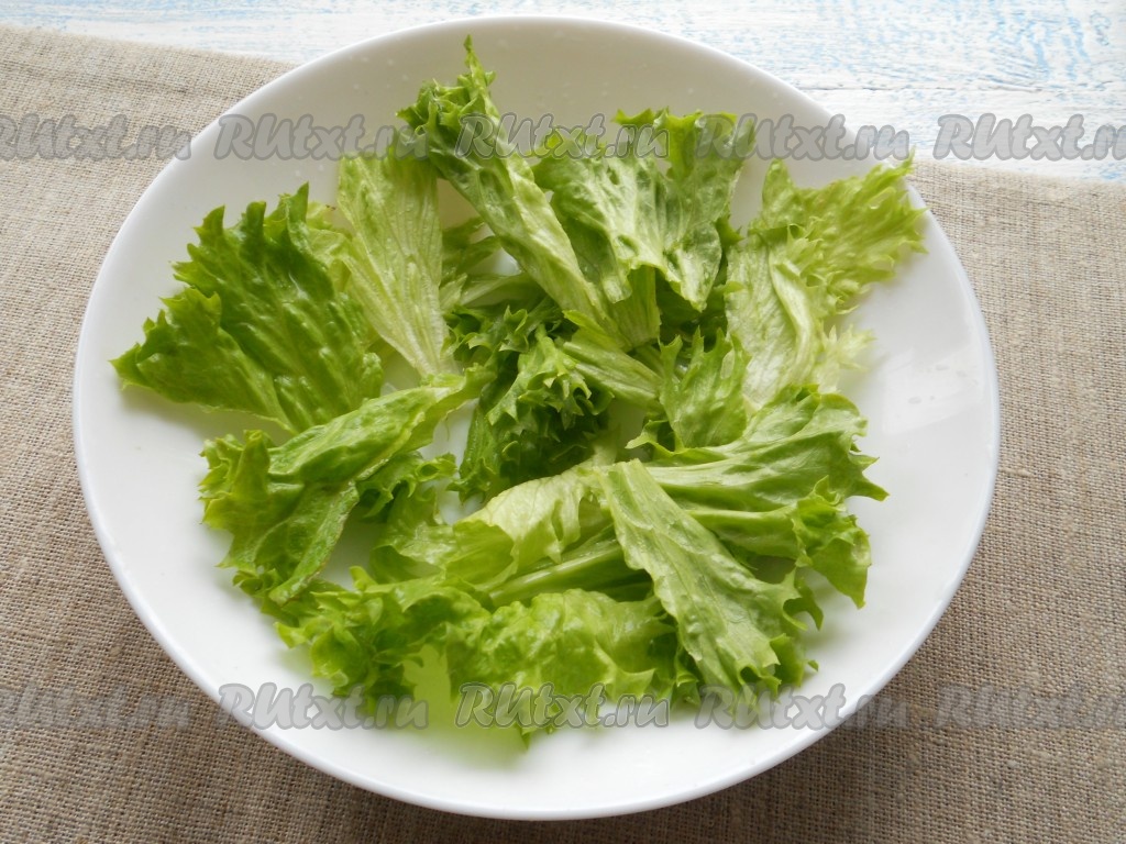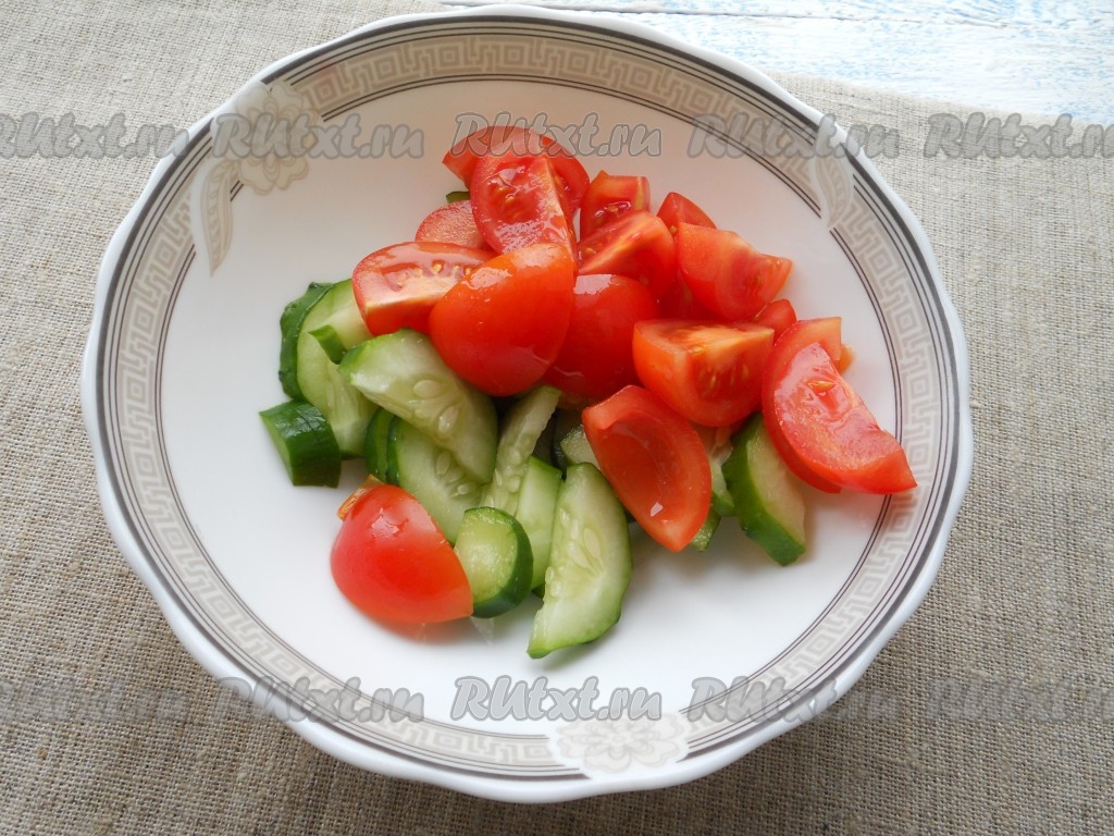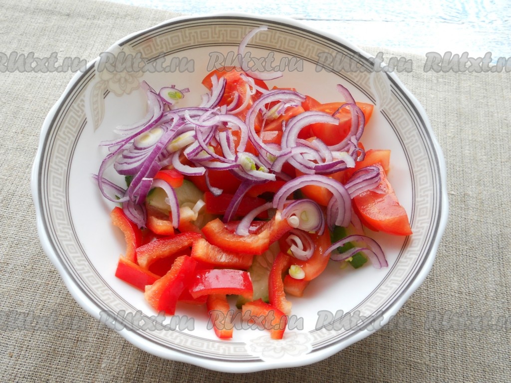 Помидоры, огурцы, листья салата вымыть, дать немного обсохнуть. Из болгарского перца удалить семена с плодоножкой. Лук очистить. Огурцы нарезать полукружочками, помидоры - дольками, сложить в глубокую миску.