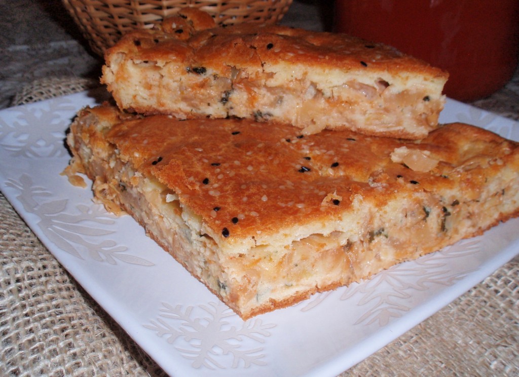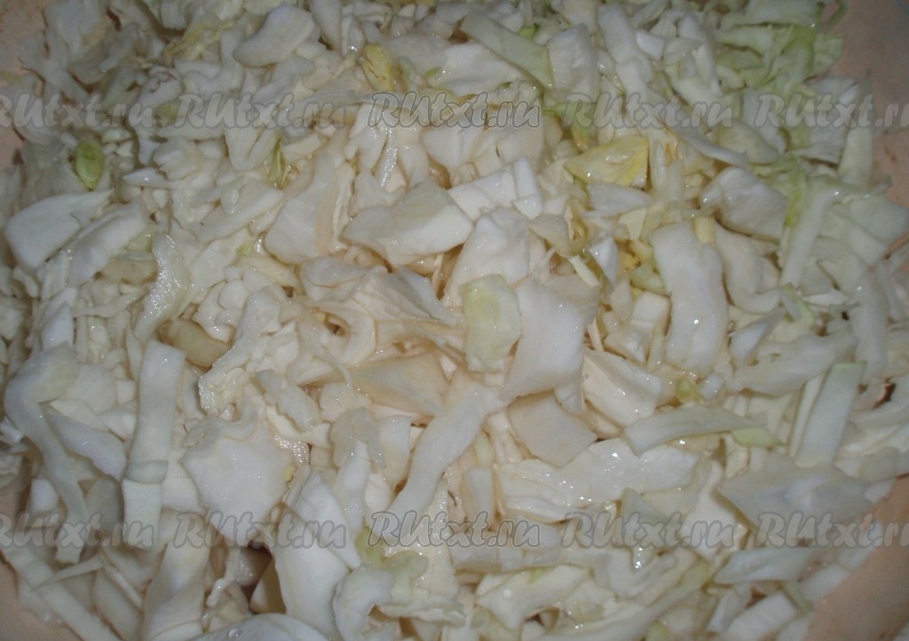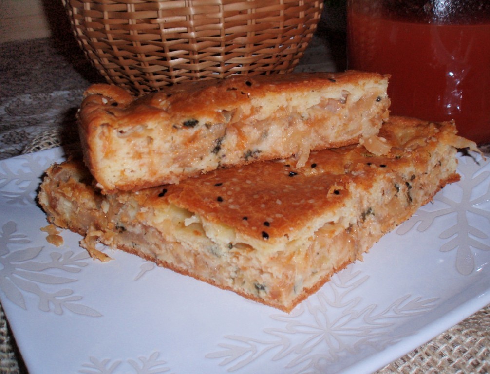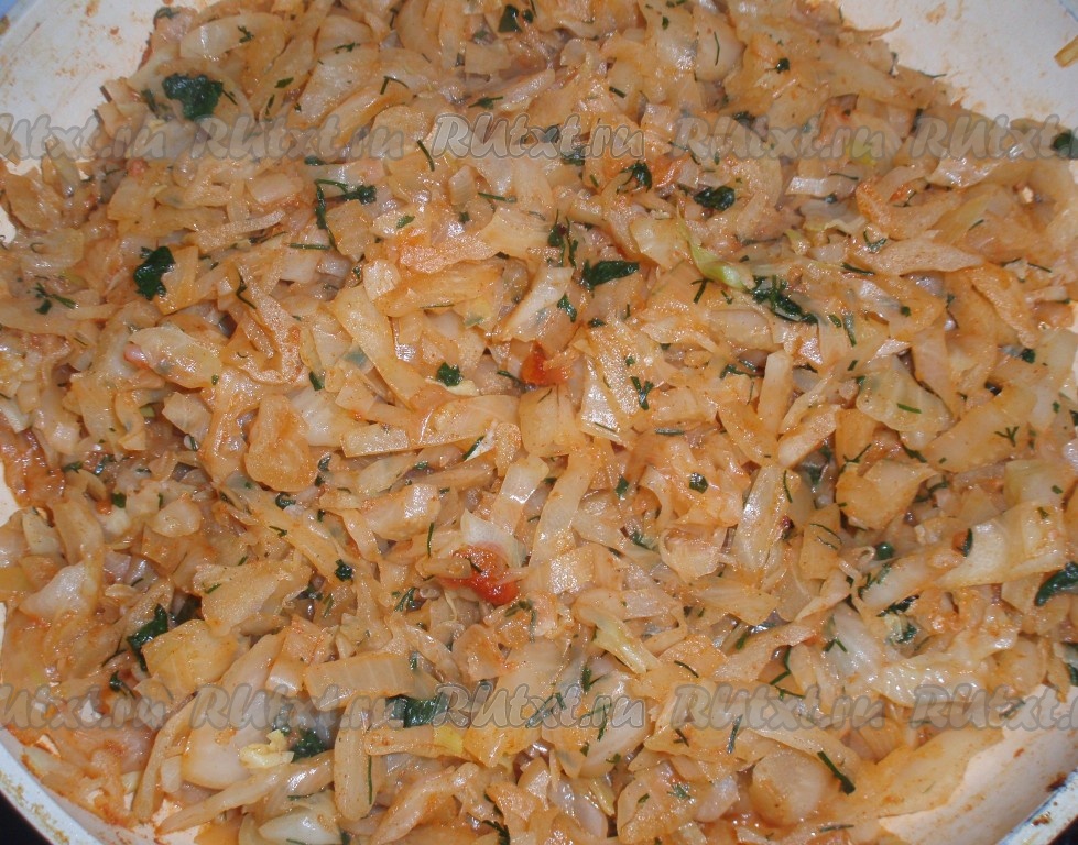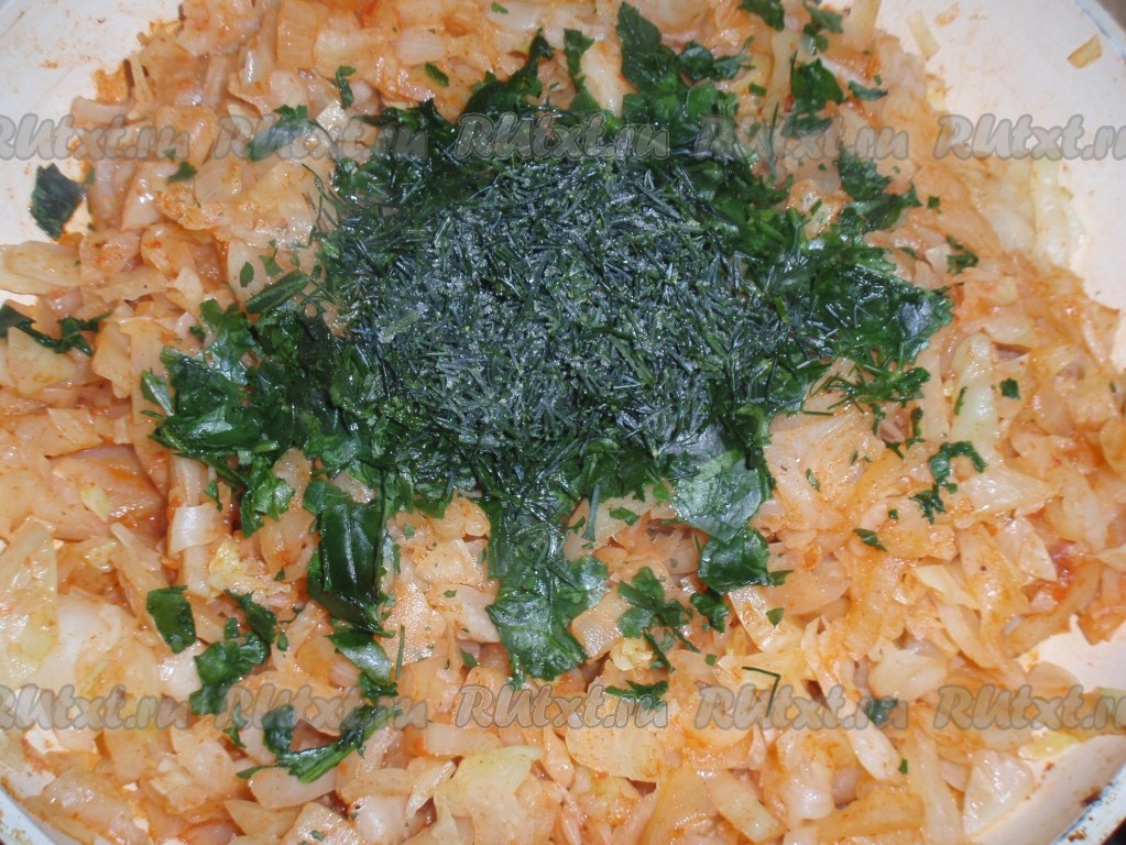 Сначала приготовить начинку. На растительном масле обжарить до золотистого цвета мелко нарезанный репчатый лук. К луку добавить нарезанную капусту, подлить немного воды и тушить на маленьком огне до мягкости капусты, иногда перемешивая.