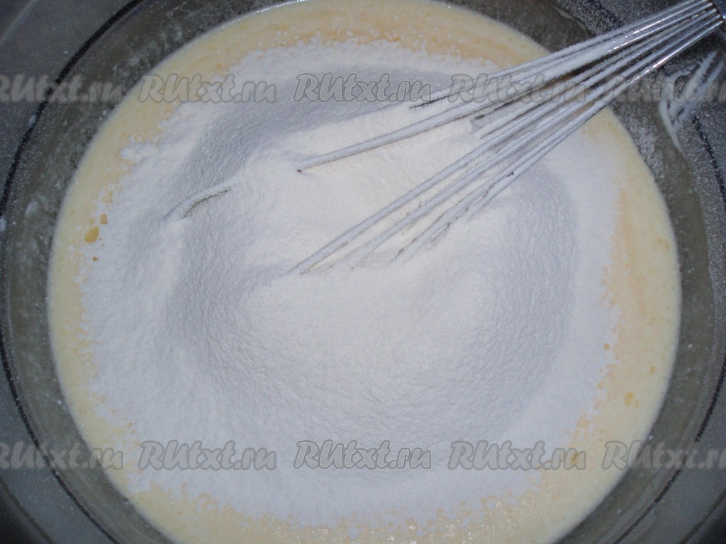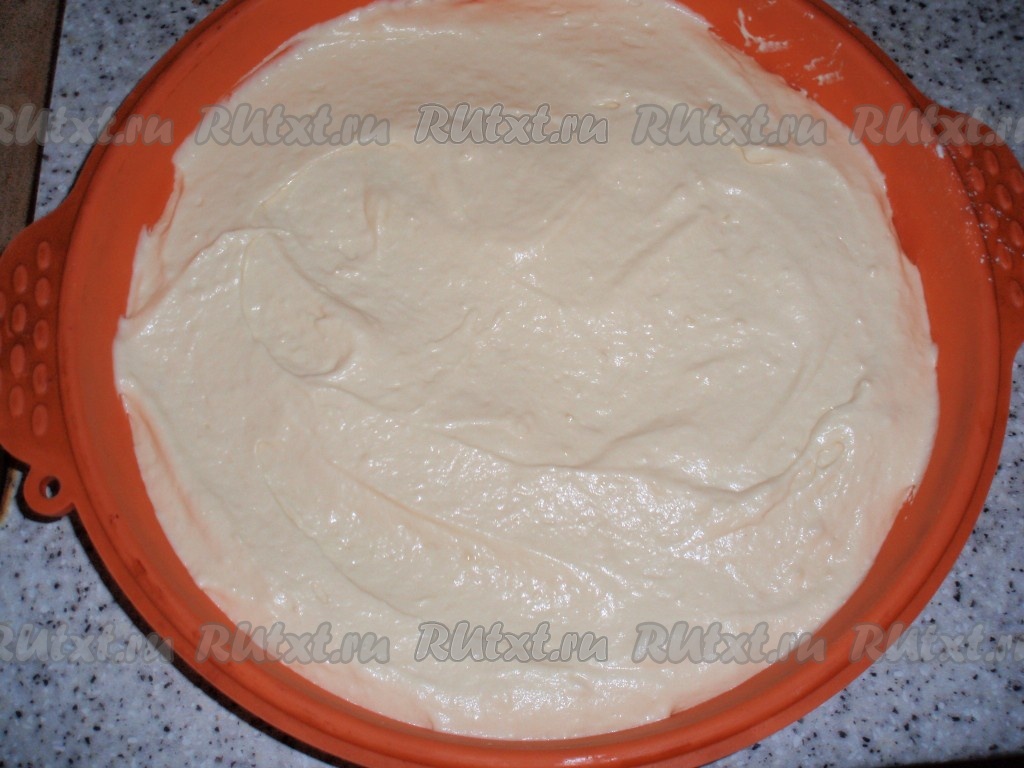 Всыпать просеянную вместе с разрыхлителем муку, аккуратно перемешивая тесто. Тесто получится, как густая сметана.