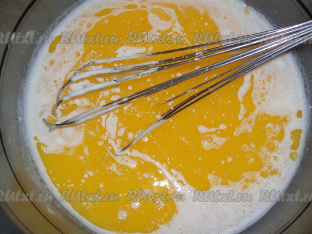 Добавить сметану в яичную смесь. Затем влить остывшее масло, перемешать до однородности.