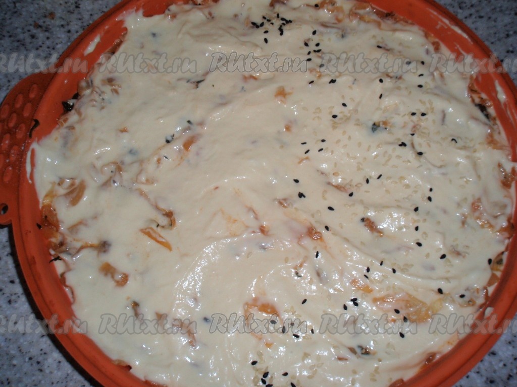 Сверху выложить остывшую капустную начинку и оставшееся тесто. Подготовленный к выпечке пирог по желанию посыпать кунжутом, отправить в разогретую духовку и выпекать 35-40 минут.