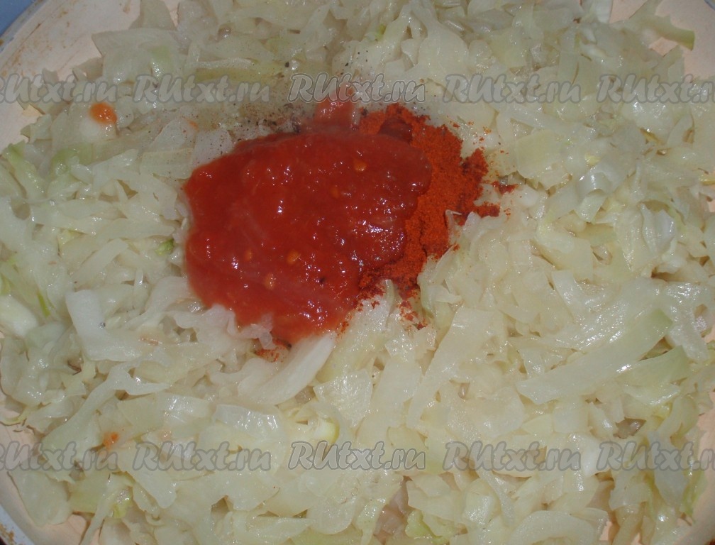Когда капуста станет мягкой, посолить, добавить паприку и томатную пасту, перемешать.