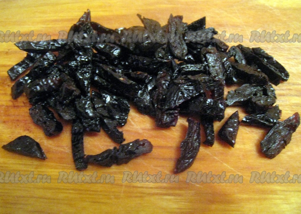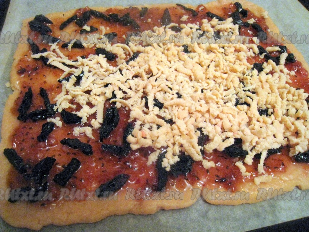 Достать из морозилки кусок теста и с помощью тёрки натереть его равномерно на начинку из варенья и чернослива.