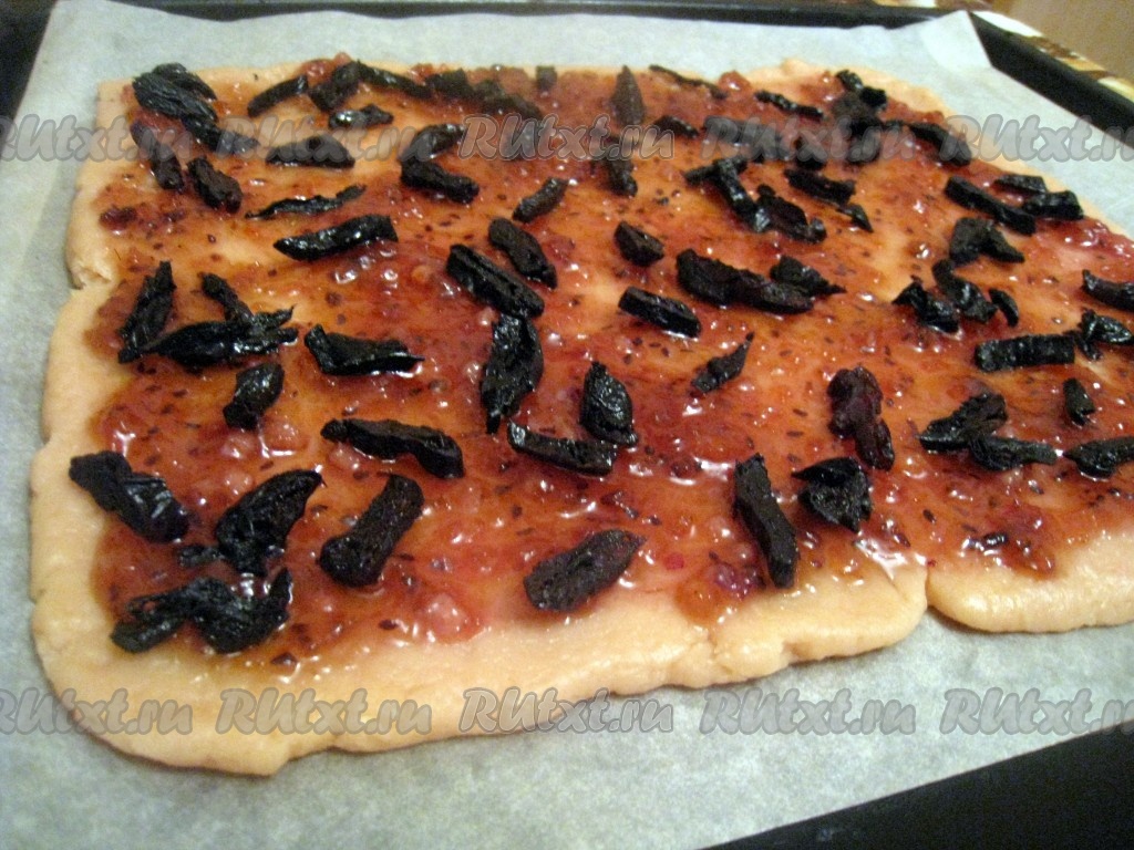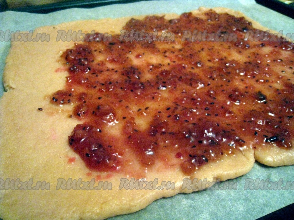 Тесто из холодильника раскатать в пласт толщиной около 1 см, выложить его на противень, застеленный бумагой (или смазанный маслом). Смазать тесто вареньем. У меня варенье из крыжовника с лимоном, подойдёт практически любое густое варенье, но лучше брать с кислинкой.