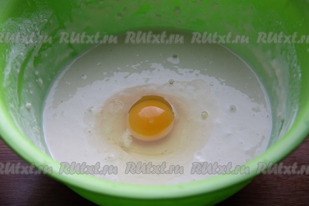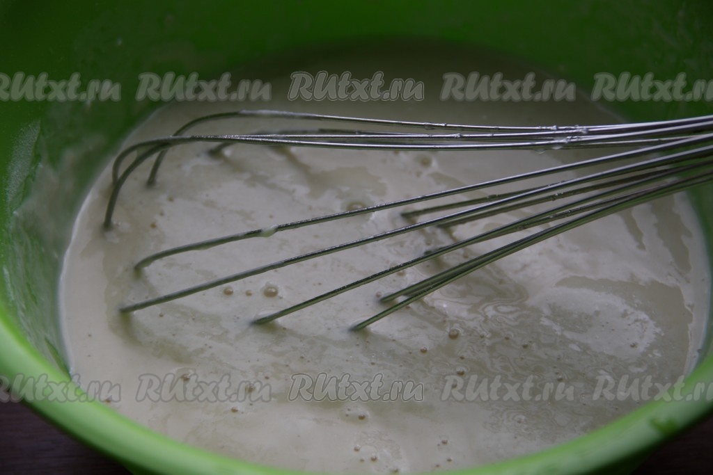 Отдельно смешать кипяток с содой и влить в тесто. Перемешать тесто до однородного состояния. Тесто получается жидким, похожим по консистенции на кефир.