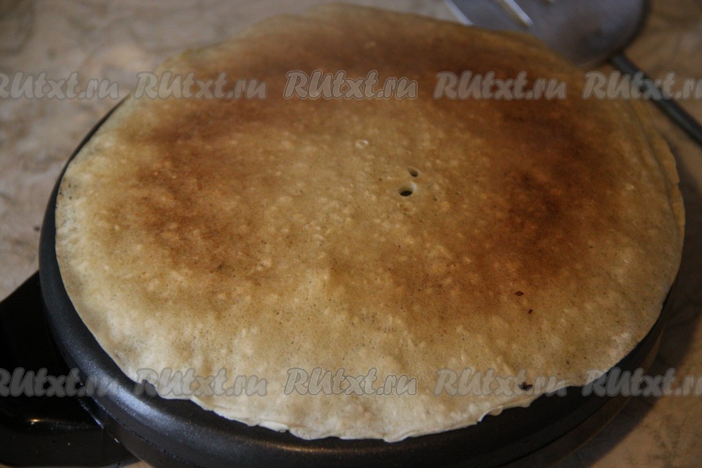 Переходим к приготовлению блинов. Я использовала блинницу, вы можете жарить на раскаленной сковороде, смазанной растительным маслом, наливая небольшое количество теста и равномерно распределяя его по поверхности.