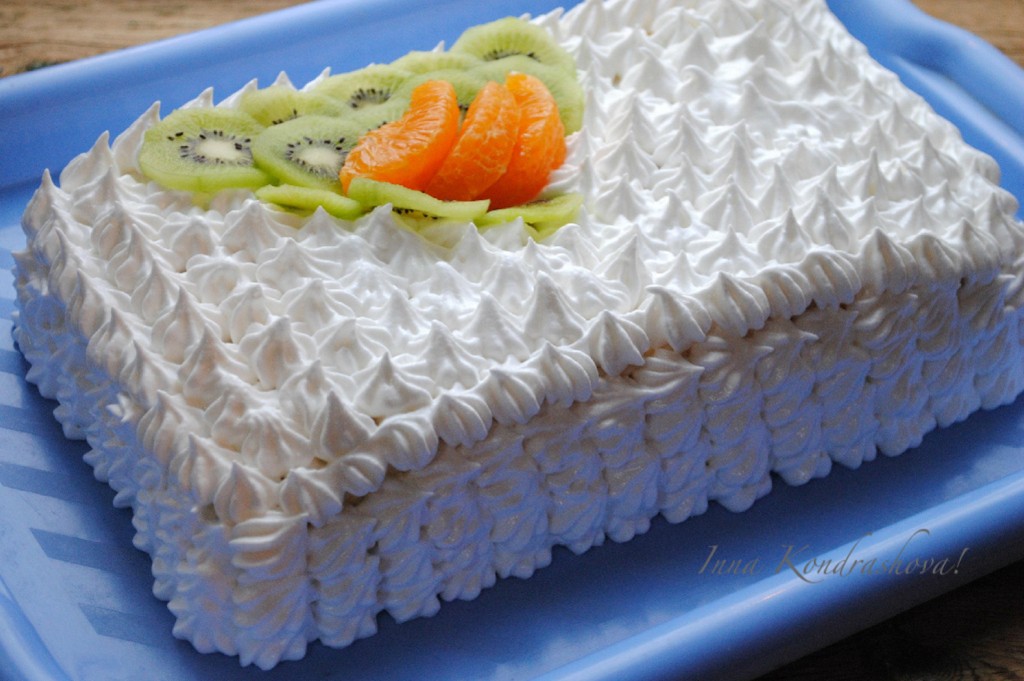 Второй корж также смазать кремом и выложить поверх фруктов (сухой стороной на верх). Затем обмазать верх и бока бисквитного торта сметанным кремом и отправить в холодильник. После пропитки торт можно украсить по своему вкусу и подать к столу. Я же предлагаю украсить его белковым заварным кремом, который сделает торт особенно нарядным.