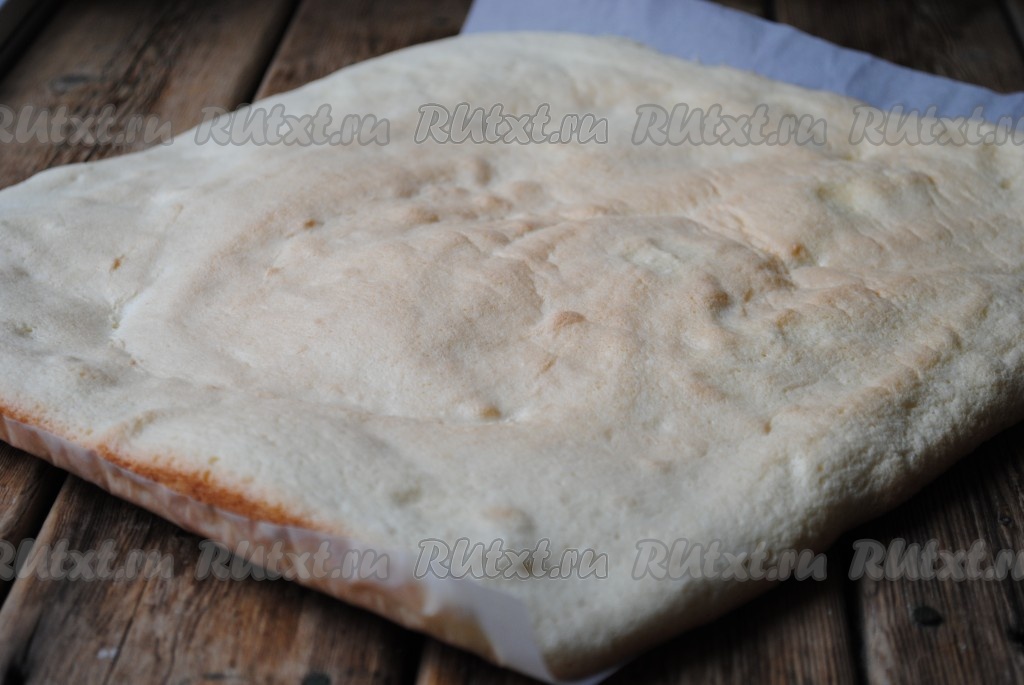 Противень застелить пергаментом и вылить тесто, разровнять его лопаткой. Отправить противень с тестом в предварительно разогретую духовку и выпекать бисквит 15-20 минут при температуре 180 градусов. Время выпечки зависит от Вашей духовки. Корж должен слегка подрумяниться и стать сверху сухим, а не липким. Готовый бисквит достать из духовки, освободить от пергамента и остудить.