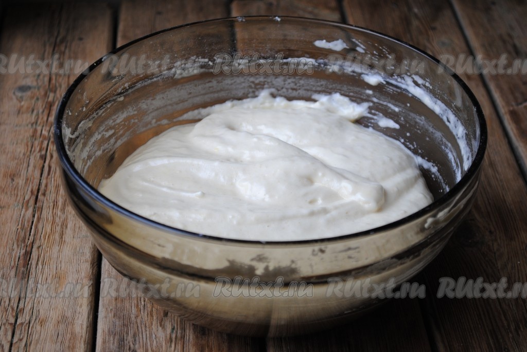 Аккуратно перемешать снизу вверх. Добавить просеянную муку и ещё раз перемешать. Тесто должно быть воздушной консистенции.
