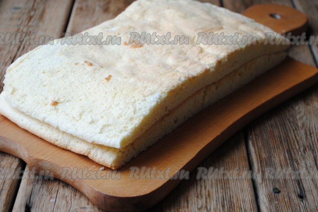 Остывший бисквитный корж разрезать на две равные части.