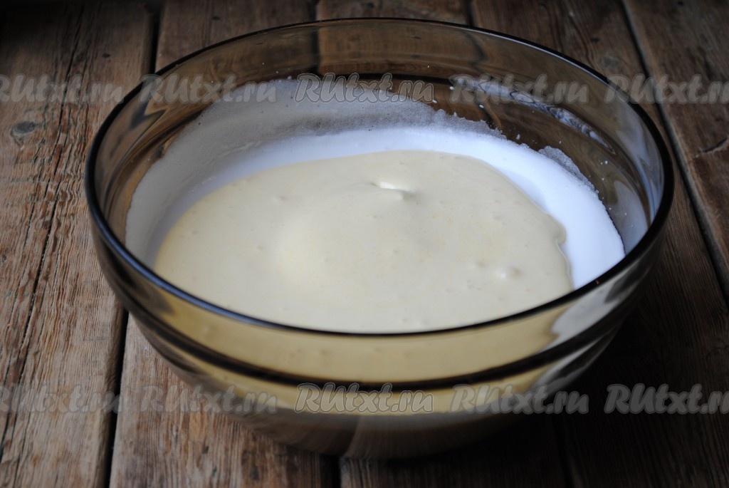 Отдельно взбить желтки с оставшимся сахаром до побеления массы и увеличения в объеме. Взбитые желтки добавить к белкам.