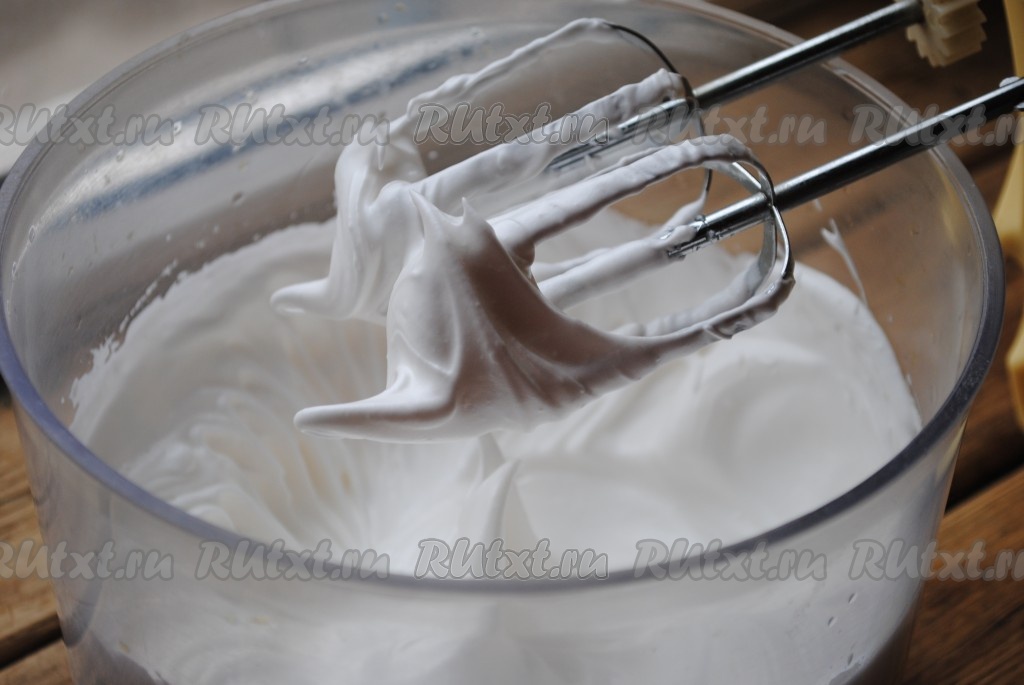 Затем, постепенно добавляя в белки 0,5 стакана сахара, взбить белки до стойких пиков.