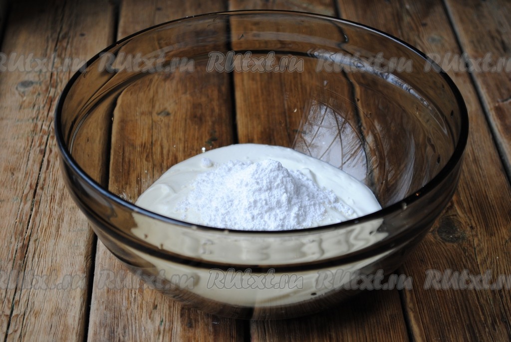 Для приготовления сметанного крема нужно соединить сметану (сметану лучше брать жирностью 20%, но подойдёт и сметана жирностью 15%) с сахарной пудрой (количество сахарной пудры регулируйте по своему вкусу) и взбить миксером до однородной консистенции.