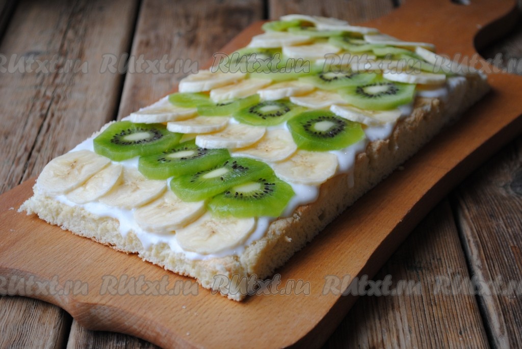 Один бисквитный корж смазать сметанным кремом, сверху выложить фрукты.