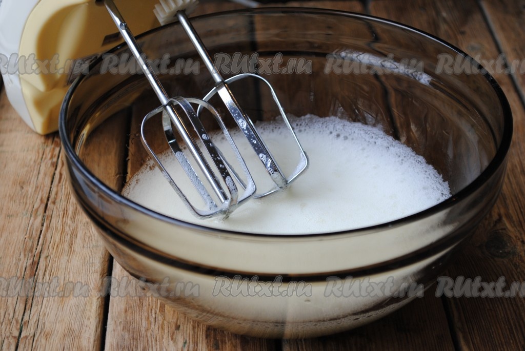 Белки со щепоткой соли взбить миксером до образования лёгкой пены.