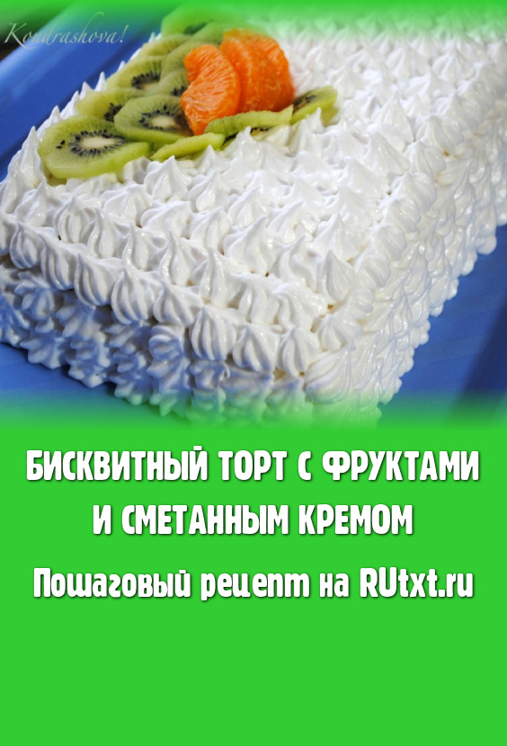 Очень вкусный, по-праздничному красивый торт можно с лёгкостью приготовить дома. Сегодня хочу поделиться рецептом бисквитного торта с фруктами и сметанным кремом. Тортик получается нежным, а фрукты делают его более пикантным (фрукты можете выбирать по сезону). Украсить его можно различными способами и кремами, я, в данном рецепте, использовала белковый заварной крем, а Вы можете выбирать на свой вкус. Приготовьте такой торт на праздник и порадуйте своих сладкоежек.