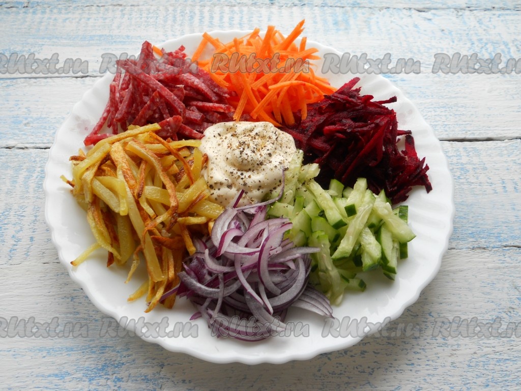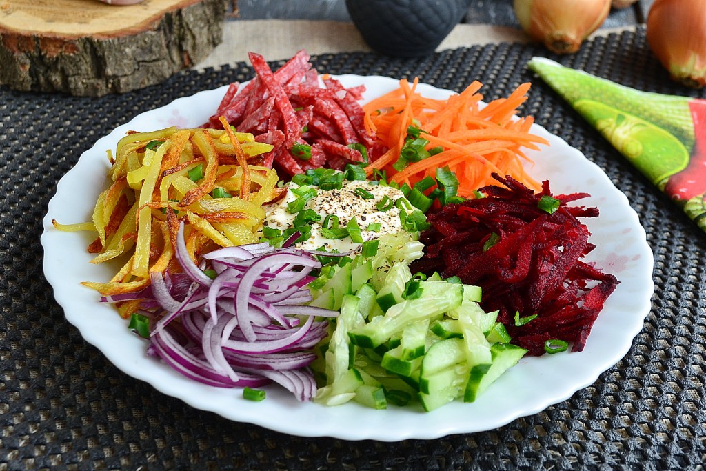 На большую тарелку выложить горками морковь, свеклу, огурцы, лук, картофель и колбасу, чередуя цвета.