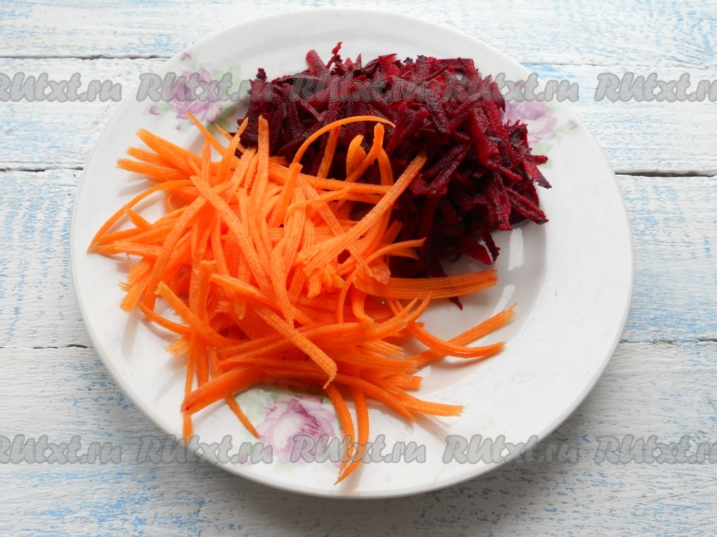 Морковь натереть на терке для корейской моркови. На той же терке (или на обычной крупной терке) натереть свеклу.