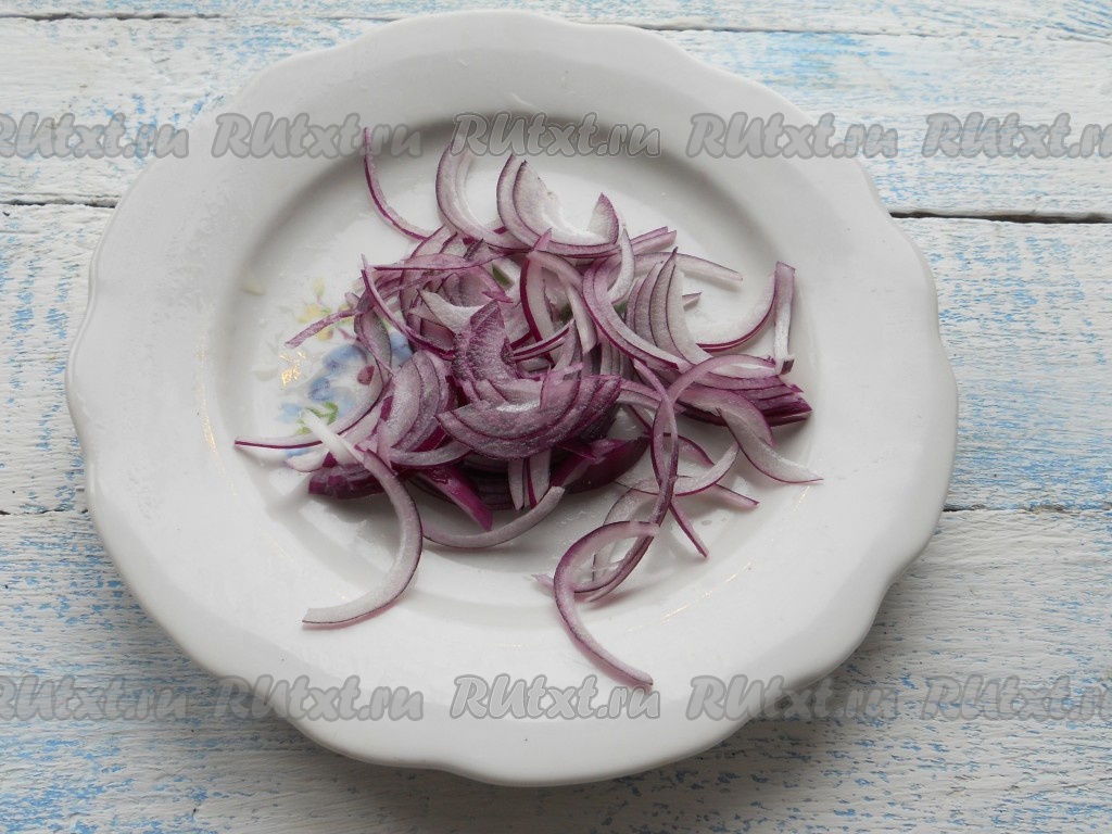 Лук нарезать тонкими полукольцами. Если используете репчатый лук, лучше его ошпарить кипятком, чтобы ушла горечь.