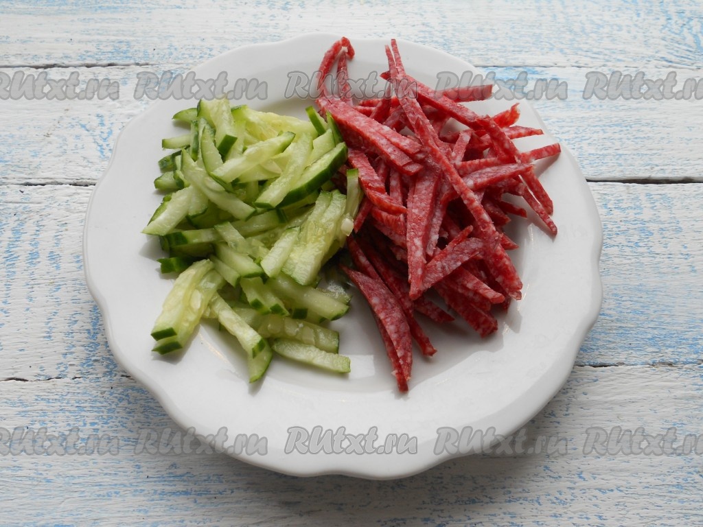 Колбасу и свежий огурец нарезать тонкой соломкой.