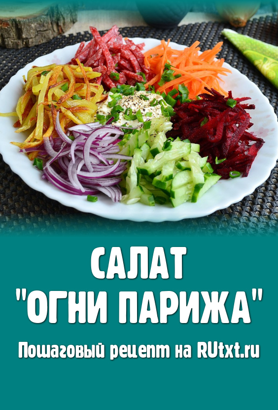 Яркий, красивый и вкусный салат "Огни Парижа" украсит любой праздничный стол. Этот интересный, с красивым названием салатик понравится вам и вашим гостям. Перемешивать салат нужно непосредственно за столом, чтобы гости вначале смогли оценить всю красоту подачи. По желанию, колбасу можно заменить мясом, можно еще добавить в салат консервированный горошек или кукурузу.