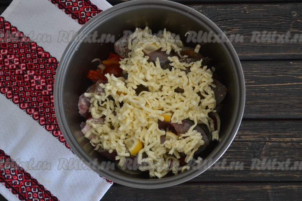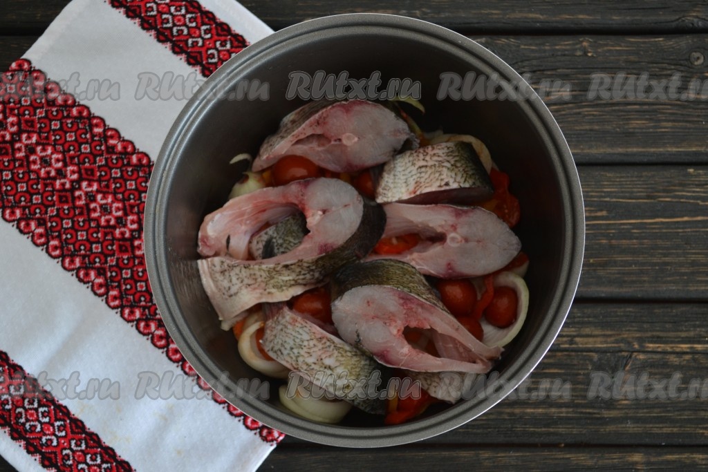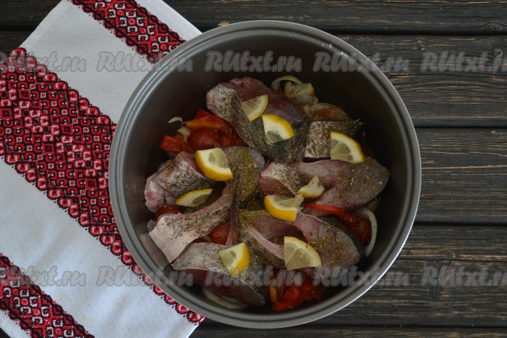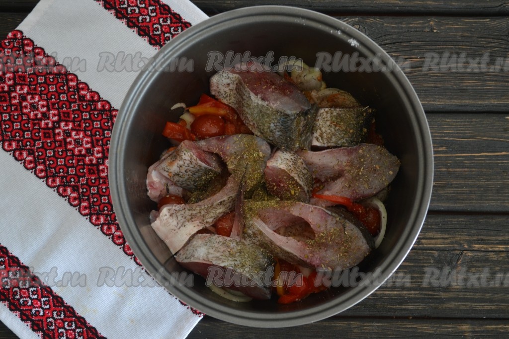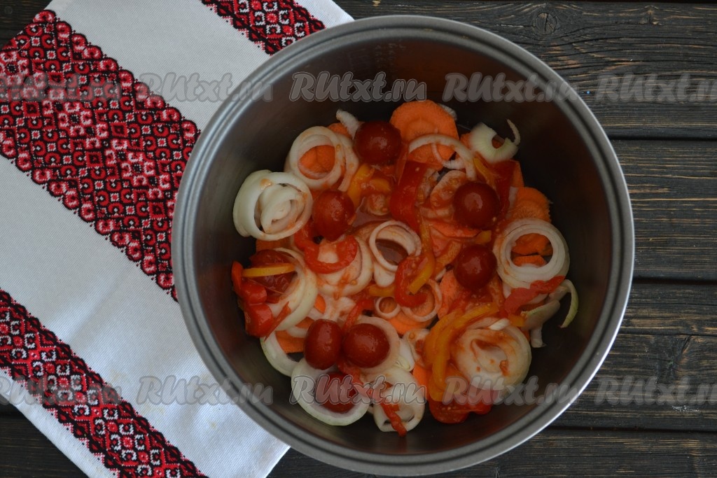 Выложить кусочки толстолобика на овощи в чашу мультиварки.