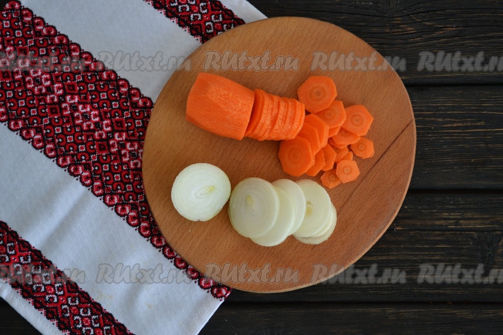Очистить, вымыть и нарезать тонкими полукольцами лук и морковь.
