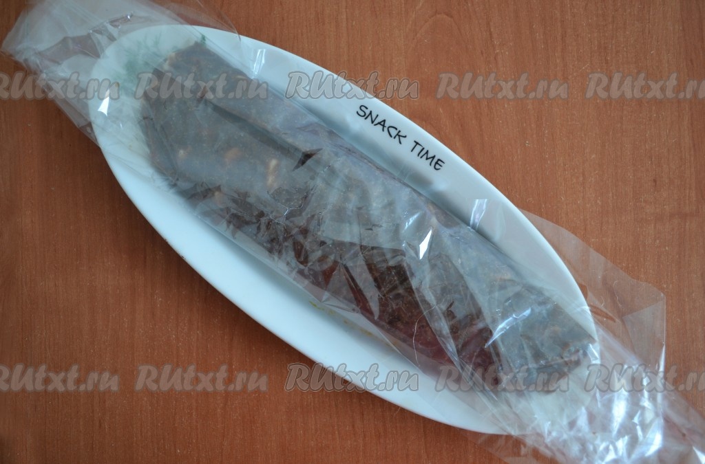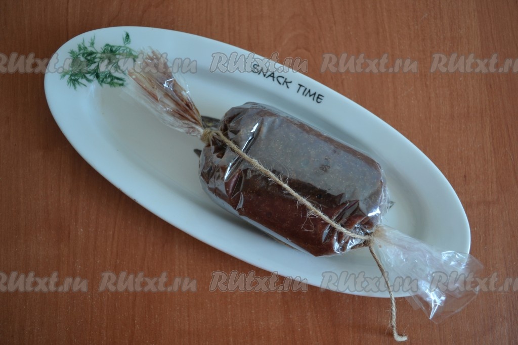 По окончании приготовления аккуратно вынуть печеночную колбасу и вместе с пакетом отправить в прохладное место до полного остывания. Перед подачей снять пакет, а колбаску нарезать кусочками.