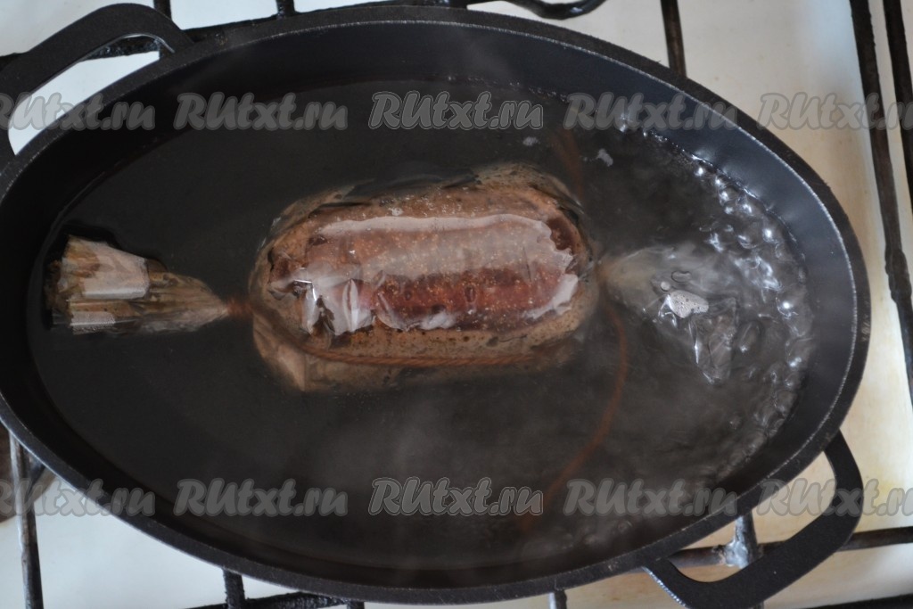 В кипящую воду аккуратно опустить пакет с будущей печеночной колбасой и снизить огонь. При слабом кипении варить 30 минут. Если колбаса не очень толстая, то и 20 минут будет достаточно.