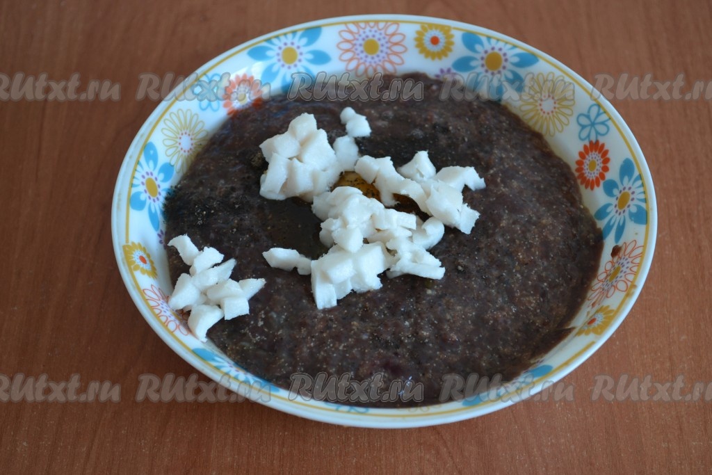 Сало нарезать маленькими кусочками (примерно 5х5 мм) и выложить к печени. При желании, сало можно пропустить через мясорубку.