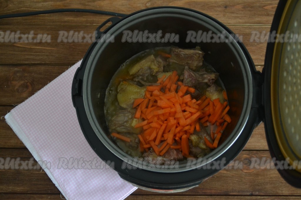 Морковь очистить, вымыть, нарезать соломкой и выложить в чашу мультиварки к обжаренным кусочкам утки.