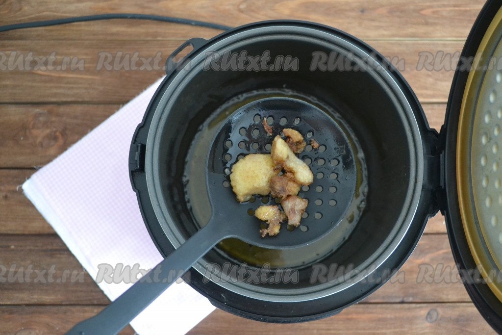 Лук выложить в кипящий в мультиварке жир и, помешивая, довести до мягкости (в течение 1-2 минут).