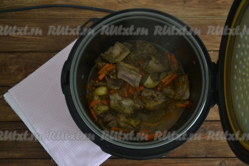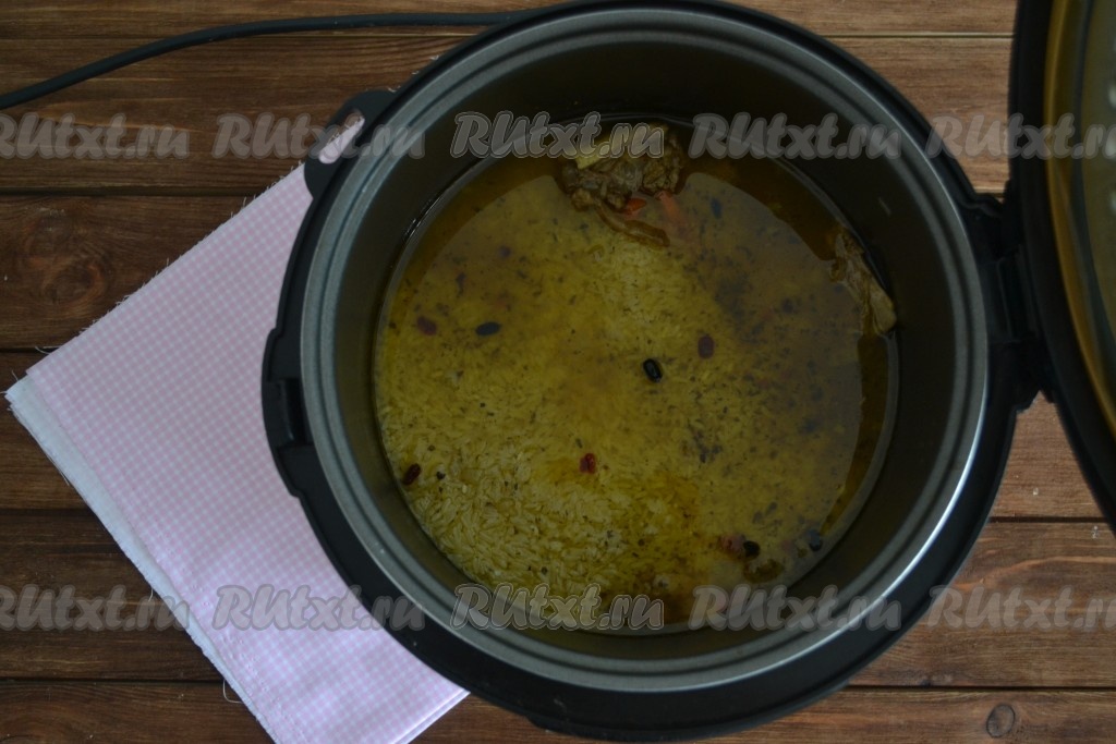 По окончании функции "Тушение", всыпать рис в чашу мультиварки. Вода должна покрывать рис, примерно, на 1-1,5 см. Если воды в чаше меньше - влейте недостающее количество горячей кипяченой воды.